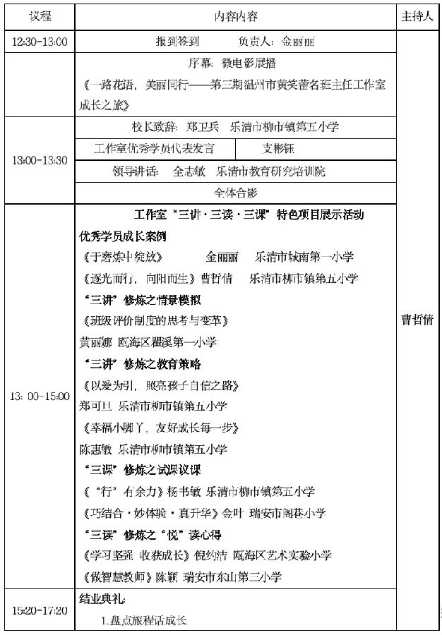 为了贯彻《教育部关于进一步加强中小学班主任工作的意见》文件精神,为发挥名师的示范辐射作用,加快班主任队伍建设,提高班主任专业素养决定举行第三期温州市黄笑蕾名班主任工作室第27次集训“三读·三讲·三课”项目研修成果展示活动(结业典礼)暨乐清市柳市镇第五小学教育集团班主任研修活动现将有关事项通知如下: