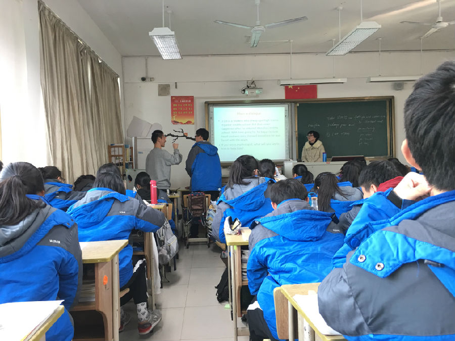 随后,王蒙老师在高一10班展示了取材自TED平台以“Stress”为话题的课堂。王蒙老师以测试“Are you stressed”的四张图片导入,开门见山,活跃课堂气氛同时话题贴近学生生活。接着抛出问题“Is stress the enemy?”让学生们阐述自己的观点,为学生观看视频1作铺垫,同时也为课堂的第三环节“How to cope the stress?”形成前后呼应。课堂上授课老师环环相扣,学生们表现精彩纷呈。从Is stress the enemy-->how to cope the stress? 王蒙老师一步步为学生搭建脚手架,深挖视频信息,既做到让学生从视频文本出发,又有对视频内容的提升。除挖掘文本之外,王蒙老师着重涉及词汇:prematurely, 这是对文本视频中跟我们目前所用的教材内容:构词法,产生联系和引申。课堂上,老师教态自然亲切,让人如沐春风。